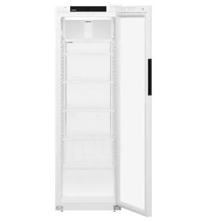 Холодильный шкаф для напитков Liebherr MRFvc 4011 Performance вмещает до 253 ПЭТ-бутылок объемом 0,5 литра или 506 банок по 0,33 литра. Благодаря динамической системе охлаждения с вентилятором, температура внутри камеры быстро снижается после загрузки новых продуктов и поддерживается на стабильном уровне. Дверь фиксируется в открытом положении при угле более 90 градусов, что предотвращает её самопроизвольное закрытие. Пять решетчатых полок можно регулировать по высоте, каждая из них выдерживает до 45 кг. Система SafetyStop предохраняет случайное выдвижение полок.
