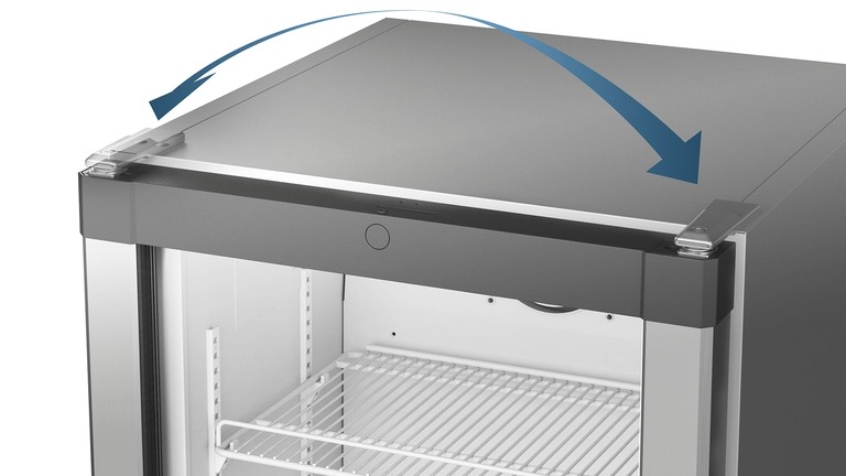 Дверь с механизмом автоматического закрытия, активирующимся при угле открытия меньше 90 градусов. Если вы оставите холодильник или морозильник открытым по неосторожности, дверь сама позаботится о сохранении температурного режима. Если откинуть дверь более чем на 90 градусов, она останется в этом положении, упрощая процесс загрузки продуктов без необходимости держать её вручную.