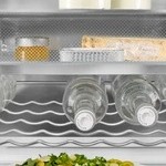Отделения в двери регулируются по высоте. Передвижной и съёмный держатель для бутылок надежно фиксирует тару. Полки выполнены из цельного пластика с обрамлением под нержавеющую сталь.